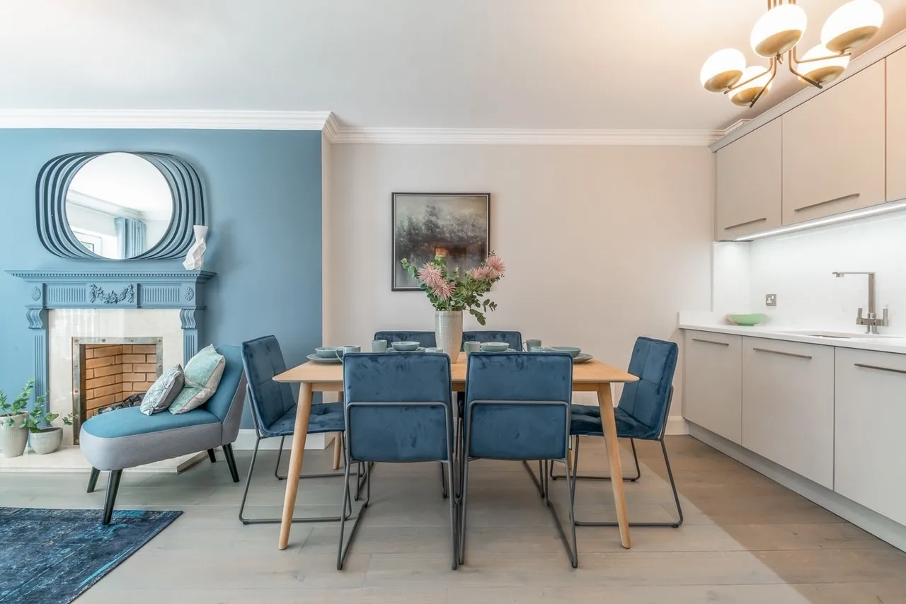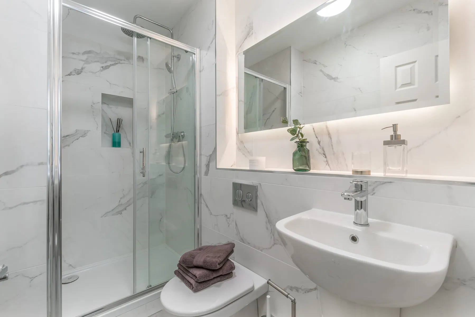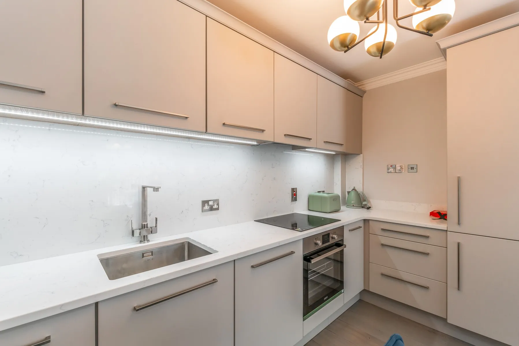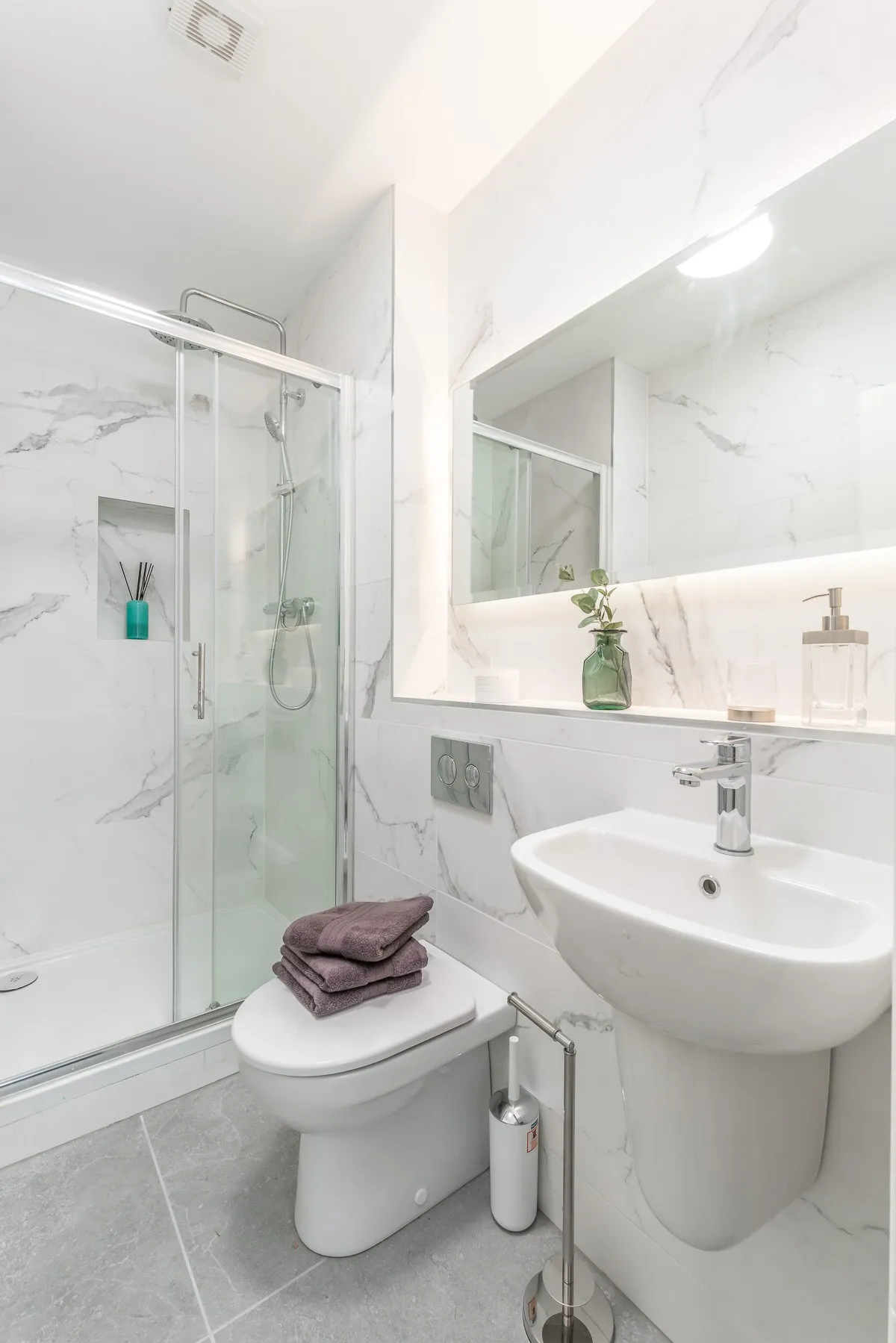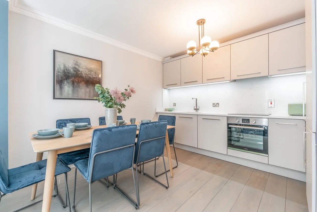 Total Fitout transformed a dated interior into a modern, functional living space. Works included complete refurbishment of the bathrooms and kitchen, installation of smoked oak engineered flooring, and a sleek, contemporary kitchen with integrated lighting designed to maximise living and dining space. The furniture was carefully selected to complement the style of the apartment, while bathrooms were redesigned to feature generous showers with concealed plumbing and cisterns.
